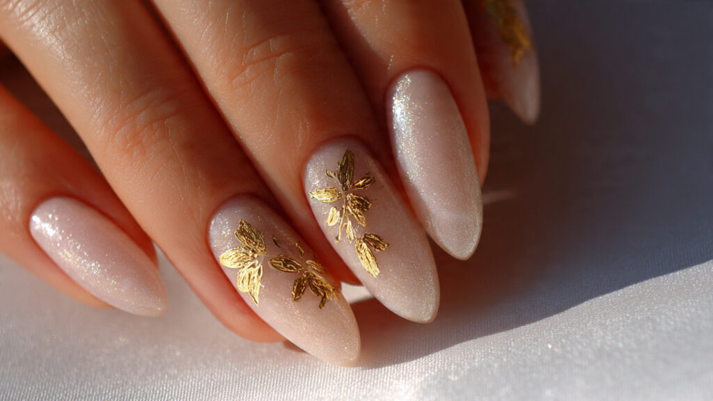 Gold foil butterflies bring a luxe touch to any manicure. A soft beige, peach, or muted pink base lets the metallic details shine. The foil catches light beautifully, giving your nails a rich, elegant feel without heavy color. This design feels polished and pairs well with gold jewelry and dressy outfits.