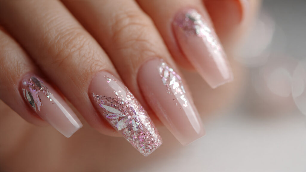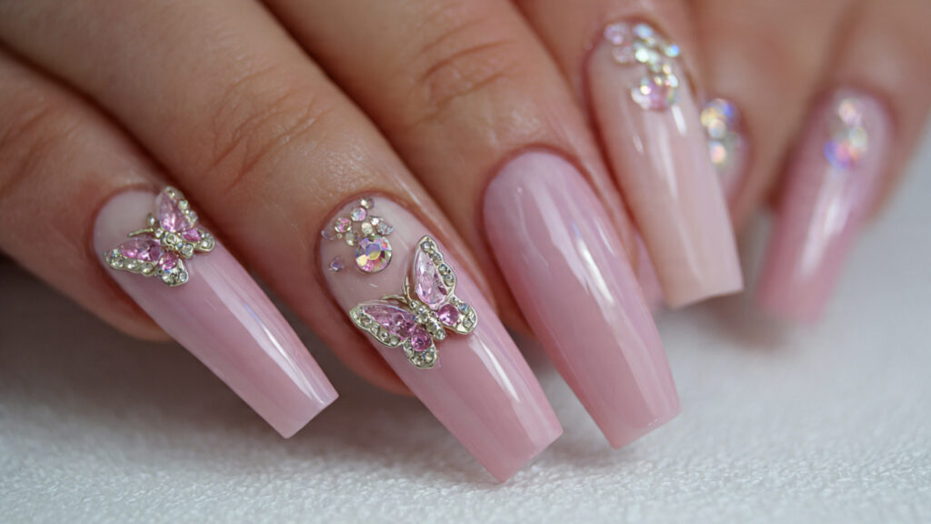 Crystals shaped into butterfly forms add serious sparkle. A soft base like blush or clear pink helps the stones stand out. This design feels glamorous and eye-catching, especially under bright lights.