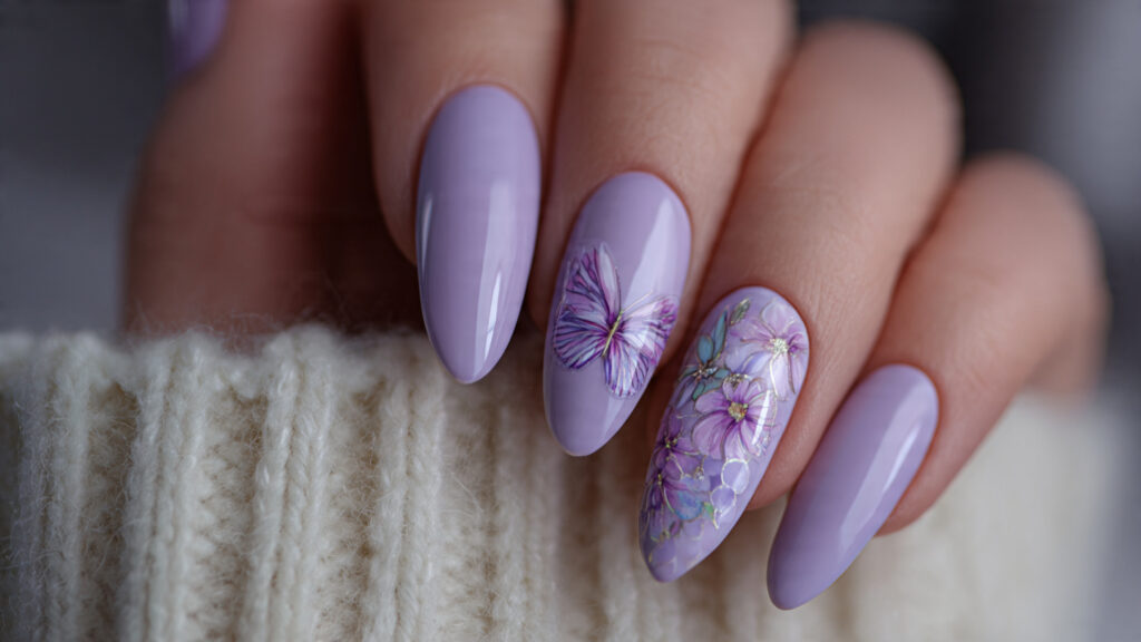 To keep this design balanced, use butterfly art on two or three nails and leave the others in solid pastel shades. A glossy top coat enhances the soft tones and makes the colors look smoother. If you want a little extra sparkle, add tiny crystals near the cuticle on one accent nail. This design works especially well on almond or oval shapes, which enhance the delicate, airy feel.