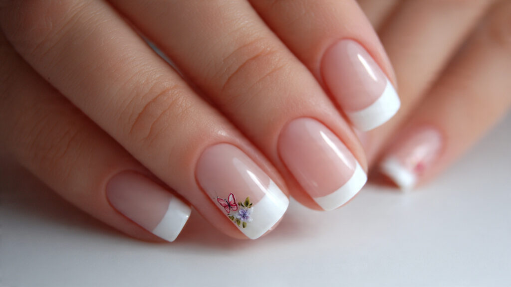 A butterfly twist on classic French tips adds personality while staying elegant. Instead of a plain white tip, add tiny butterfly outlines near the edge or corner of the nail. This keeps the design subtle from a distance but fun up close. It’s ideal if you like clean styles but still want something different from the usual French manicure.