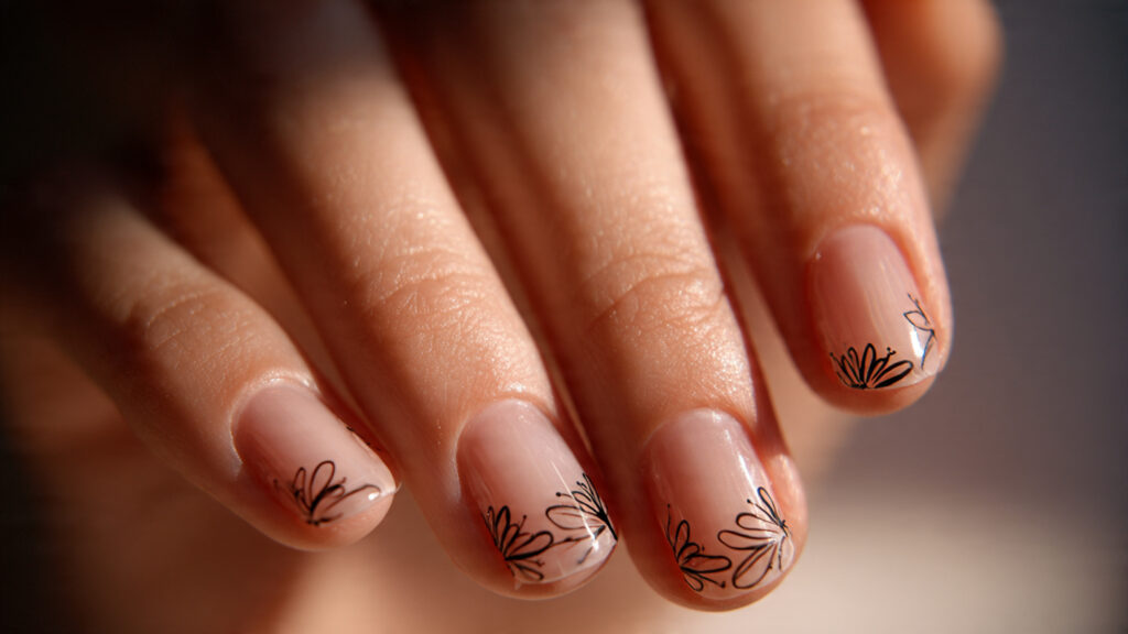 Minimal butterfly line art is perfect if you like subtle designs. A sheer or milky base keeps the nails looking clean, while fine black lines create tiny butterfly shapes. The result is simple but artistic, adding interest without strong color.