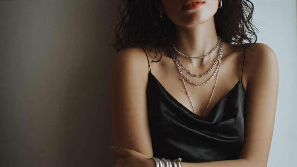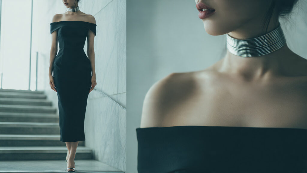 An off-shoulder dress beautifully frames the neckline and collarbone. Adding a silver choker enhances this area, drawing attention upward. The contrast between smooth black fabric and metallic shine feels modern and refined.