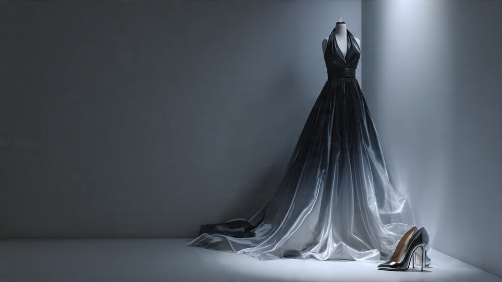 An ombre dress that fades from black into silver creates a striking visual effect. The gradient design feels artistic and unique, making it a standout choice for special events. It blends both colors seamlessly rather than separating them.