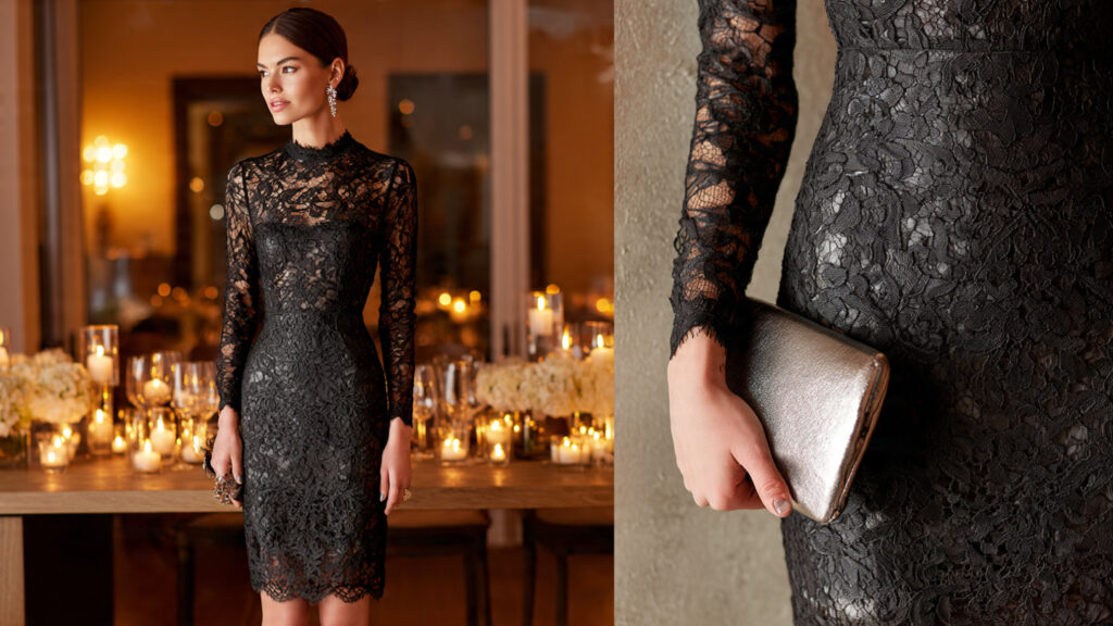 Black lace carries timeless romance. The intricate patterns create visual interest while maintaining sophistication. Pairing it with a silver clutch adds a modern contrast that prevents the look from feeling too traditional.
