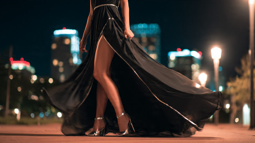 A black maxi dress offers drama and elegance in one silhouette. When designed with a silver-trimmed slit, it introduces both shine and a hint of boldness. The length keeps it sophisticated, while the slit adds movement.