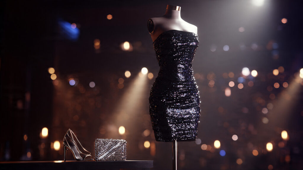A black sequin dress is the definition of instant party glam. The sparkle catches every bit of light, making you shine from every angle. Pairing it with sleek silver heels keeps the look cohesive and polished. The contrast between deep black shimmer and metallic silver creates a balanced statement without feeling overwhelming. This combination works beautifully for cocktail parties, birthday celebrations, and New Year’s events.