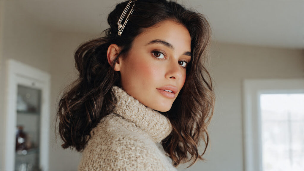 Twist the top section of your hair back and secure it with a medium-sized clip. Let the rest fall naturally or add loose waves for extra softness. This hairstyle looks great with sweaters and layered outfits, making it an easy choice for both casual days and relaxed social plans.