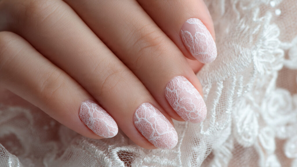 Lace nail art is a romantic detail that connects your manicure to classic wedding fabrics. Inspired by lace veils and dress textures, these delicate patterns add softness and femininity to your overall look. When done with thin lines on a pale pink or milky base, lace designs appear airy rather than heavy, making them ideal for elegant bridal styling.