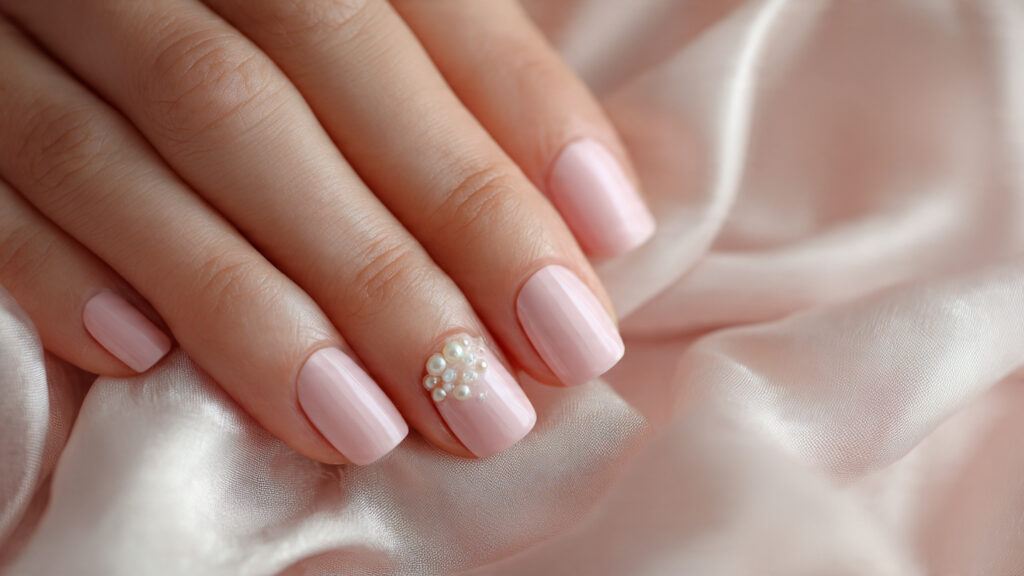 Tiny pearls add texture and a bridal touch without being flashy. Keeping embellishments on just one nail maintains balance and elegance.
