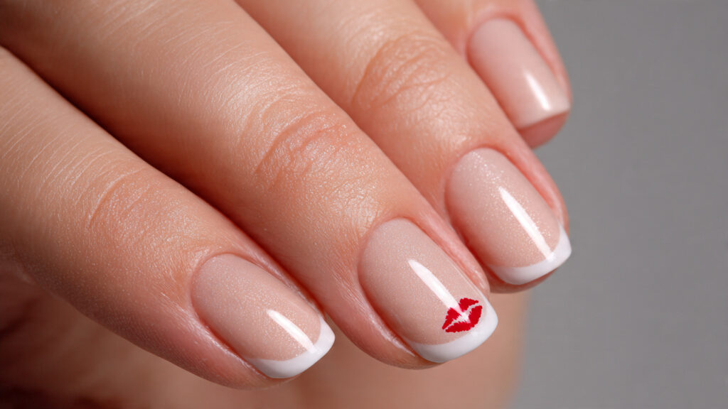 This design reinvents the traditional French manicure by adding a small kiss print near the tip or side of one nail. The clean white tips keep things polished, while the kiss detail adds personality. It’s a great choice for those who love classic styles but want something fresh.