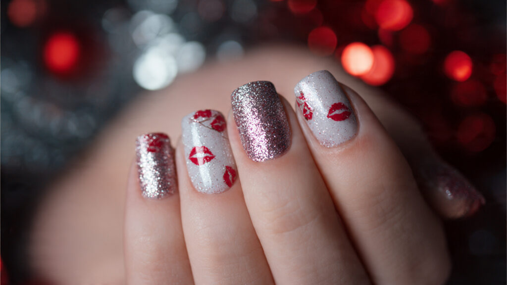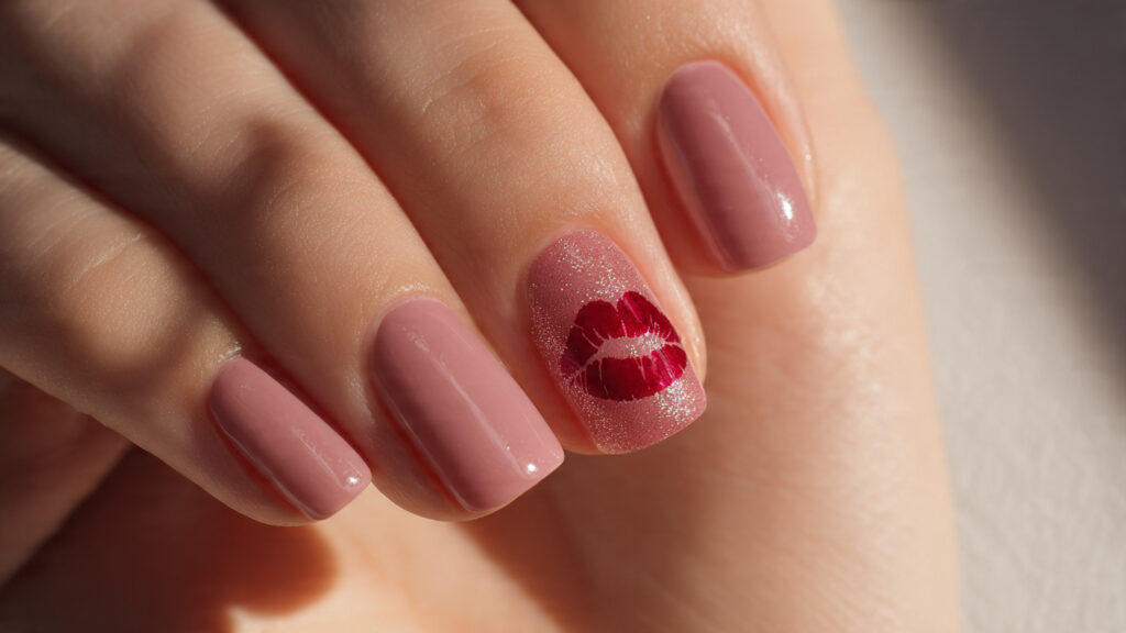 Glitter and kisses are a fun pairing for anyone who loves a little sparkle. Usually, the glitter stays on one or two accent nails, with kiss prints layered over or beside it. This keeps the design balanced and wearable.