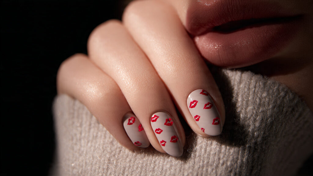 Short nails can still make a statement with small, carefully placed kiss prints. Tiny lips near the cuticle or corner of the nail feel charming and intentional. This design proves nail art doesn’t need length to stand out.
