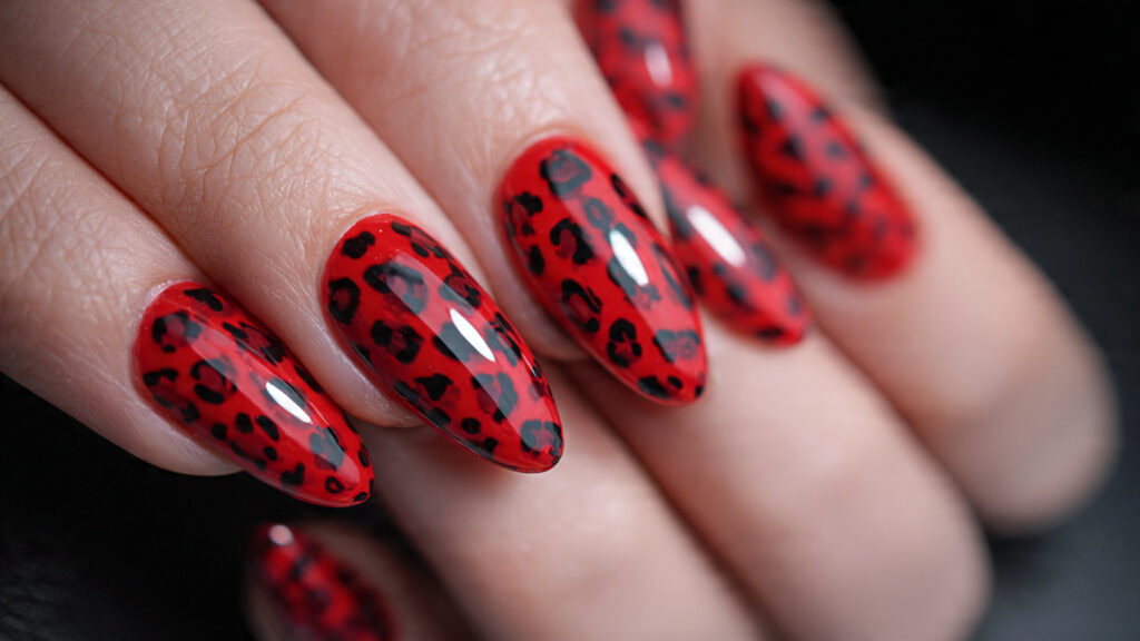 Using bold colors like red, blue, or green transforms leopard nails into a statement accessory. The vibrant base instantly draws attention, while classic black spots keep the design recognizable. This look is ideal for those who love expressive, fashion-forward styles.