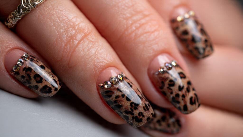 Rhinestones add sparkle and texture to leopard nails. Small crystals placed strategically elevate the design without overpowering it. This style feels glamorous yet tasteful.