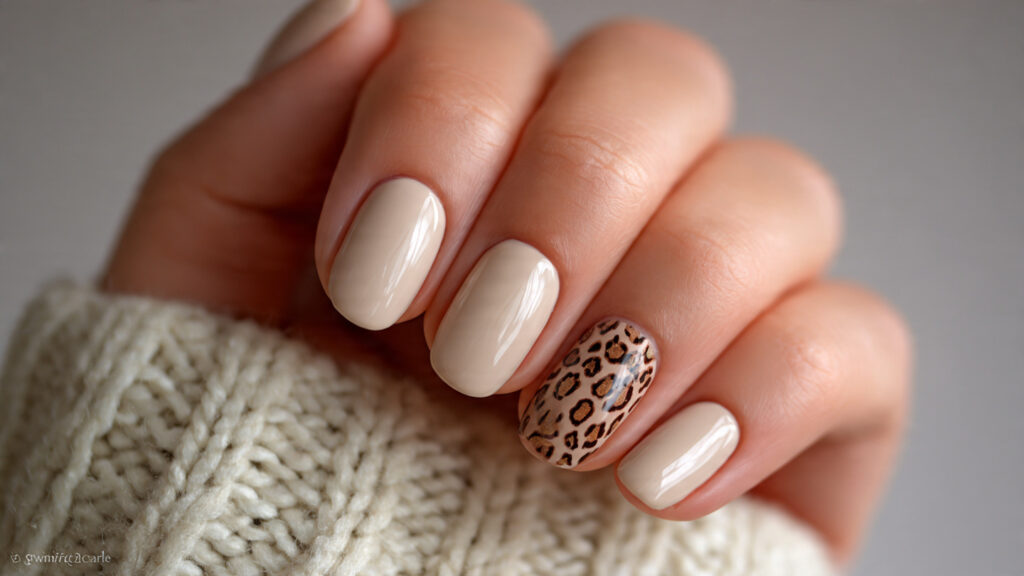 Choose neutral shades for the solid nails to let the accent stand out. Keeping the leopard pattern delicate ensures cohesion. This approach works well for short nails and everyday wear while still adding a stylish twist.