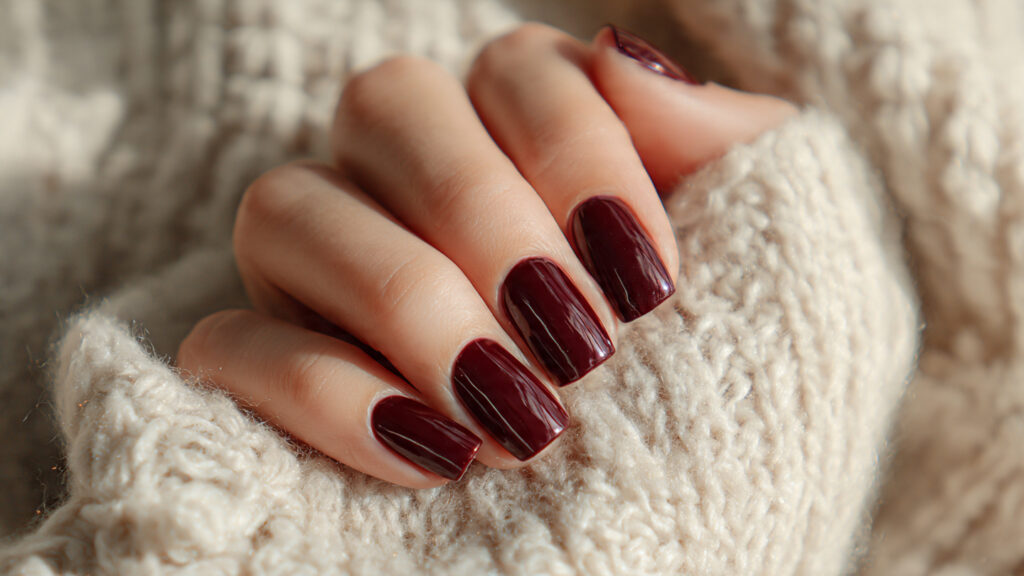 Deep burgundy nails instantly feel rich and cozy during winter. The glossy finish enhances the depth of the color, making short nails look polished and intentional. This shade flatters most skin tones and pairs beautifully with neutral winter outfits like beige coats, gray scarves, and black boots. The shorter length keeps the bold color practical and wearable for everyday life.