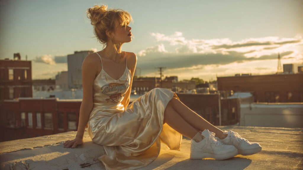 This combination works perfectly for casual dinners or creative events. Choose a graphic tee that reflects your personality band logos, minimalist prints, or vintage designs all work well. Add a small shoulder bag and delicate layered chains to complete the look. The shine of satin catches light beautifully, making it ideal for golden-hour photos and evening strolls.