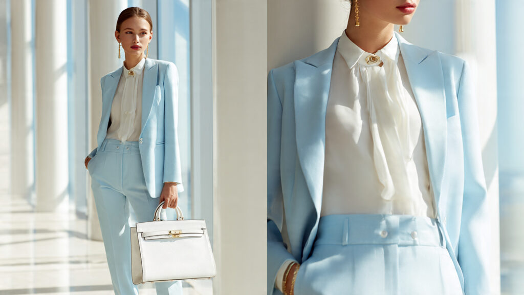 A pastel suit captures the spirit of spring while remaining office-appropriate. Shades like soft blue, blush, or sage feel fresh but not overpowering. Tailoring is key to maintain professionalism.
