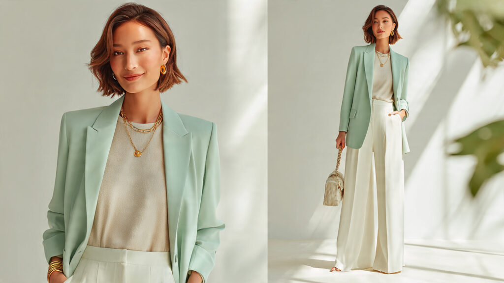 A tailored blazer paired with wide-leg trousers is the definition of effortless polish. Choose a soft pastel like sage, powder blue, or blush to embrace spring without sacrificing professionalism. The wide-leg silhouette adds movement and comfort, while the structured blazer keeps everything sharp. This combination works beautifully for presentations, client meetings, or everyday desk work.