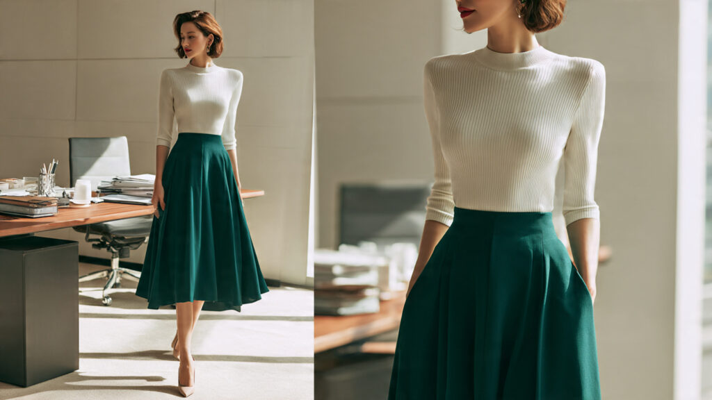 This look offers versatility because you can mix and match both pieces separately. The skirt flows beautifully as you walk, adding subtle elegance. Choose closed-toe pumps or sleek flats for comfort. It’s ideal for creative workplaces or days when you want something polished but not overly structured.