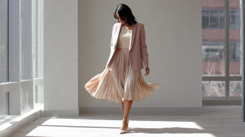 A cropped blazer modernizes traditional office wear. Pair it with a pleated midi skirt for a graceful, feminine touch. Soft colors like dusty rose or light gray feel fresh and appropriate for spring.