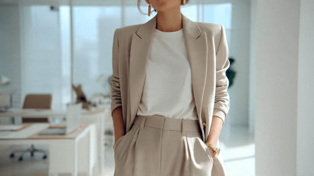 Add texture through fabric choices like lightweight wool or crepe. Break up the look with a crisp white top underneath. This outfit works for busy mornings when you want something quick yet impactful. It’s timeless, versatile, and easy to refresh with different accessories.