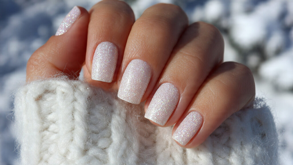 This shade works especially well on shorter nails and pairs nicely with cozy winter layers. The soft pink base keeps the look versatile, while the sparkle adds just enough glow to make it feel winter-ready. It’s an excellent everyday option that feels polished and comforting.