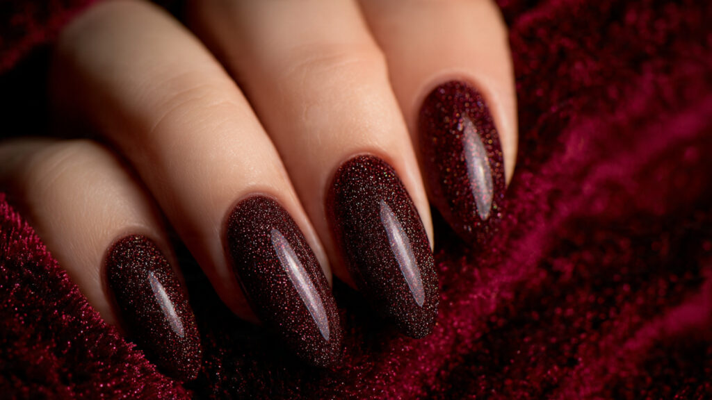 This design works especially well on almond or oval-shaped nails, enhancing the natural curve of the hand. Pair it with gold jewelry or soft makeup tones to create a cohesive winter look. Burgundy glitter nails transition effortlessly from casual daytime wear to evening events, making them a versatile option you’ll love all season long.