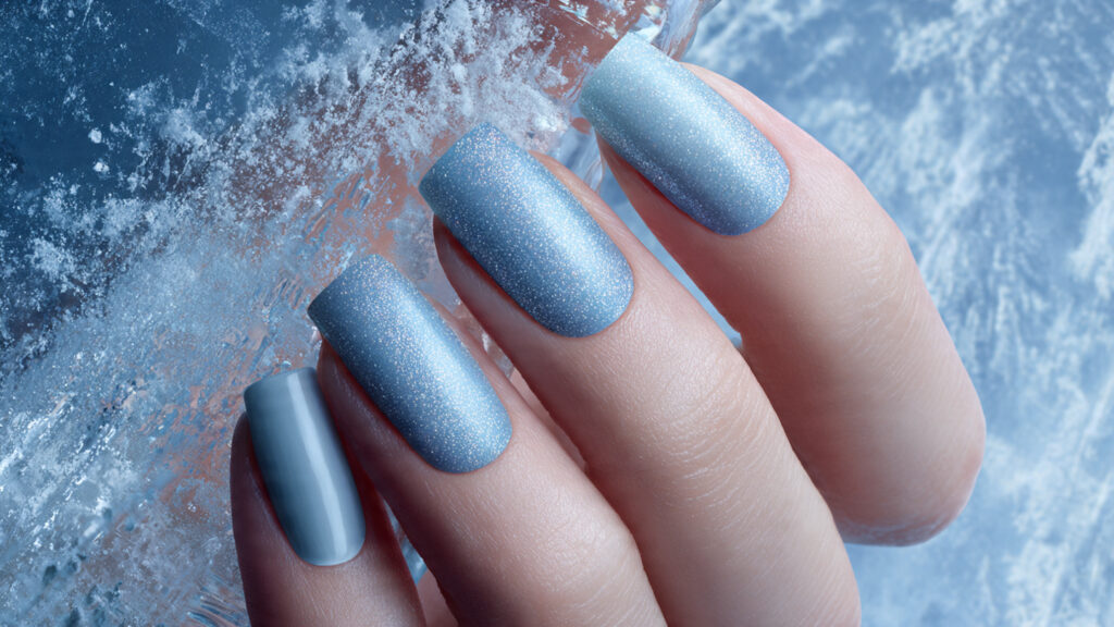 Icy blue nails instantly capture the feeling of winter air and frozen landscapes. This shade feels refreshing and crisp, while the shimmer adds just enough sparkle to keep things interesting. It’s a great alternative to classic neutrals if you want something playful yet still seasonally appropriate.