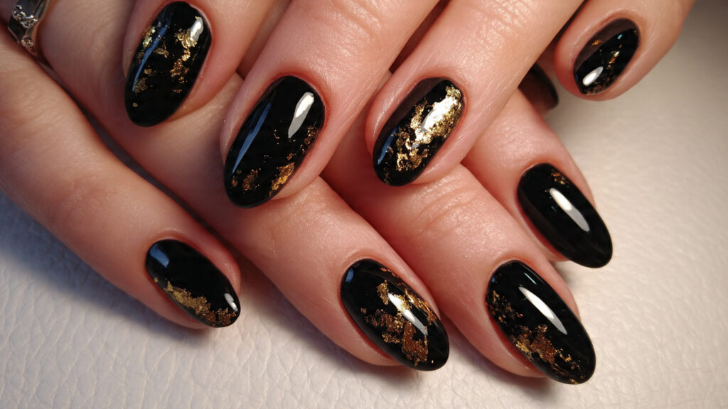 Gold foil details elevate black nails instantly. The contrast between dark and metallic creates a luxurious feel without heavy design work. Each foil placement adds uniqueness, making the manicure feel custom.