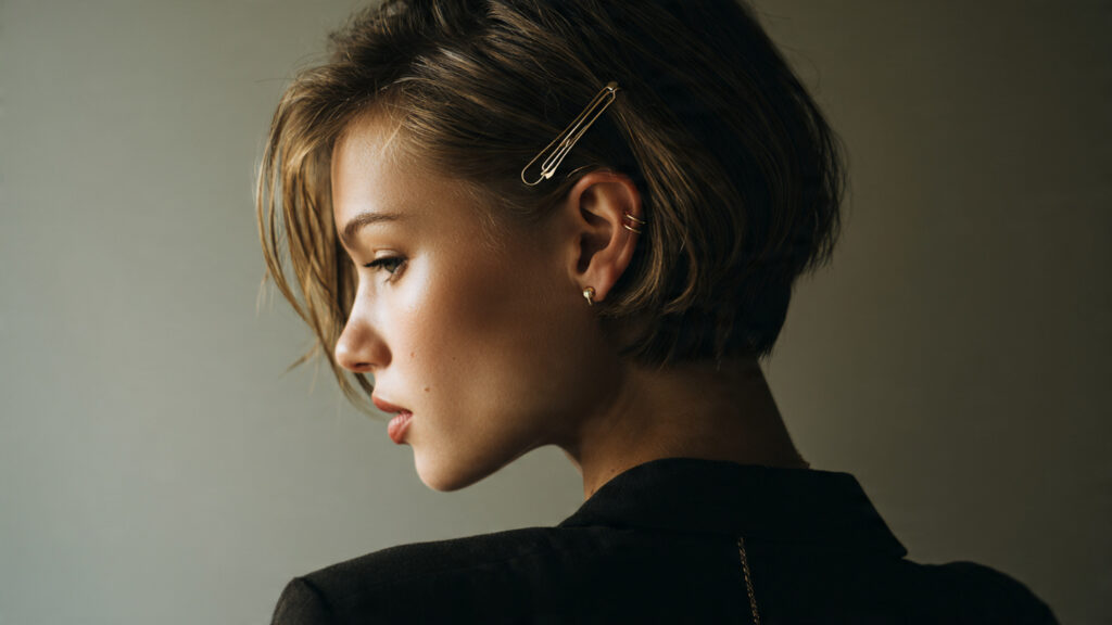 Clipping one side of short hair back creates instant visual interest and keeps hair out of your face. This style is both practical and stylish, making it perfect for daily activities. It works well with decorative clips or simple pins, depending on your preference.