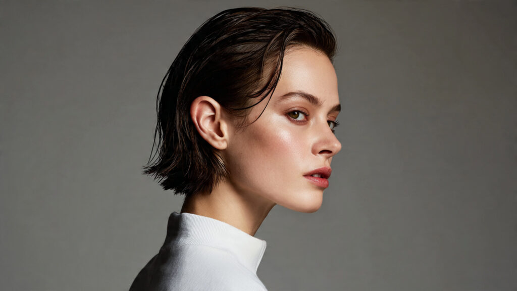 A slicked-back short hairstyle creates a bold, confident look that still works for daily wear when styled lightly. This look emphasizes facial features and gives short hair a strong, modern edge.