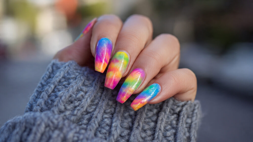 Tie-dye rainbow nails bring a retro festival vibe to your manicure. Softly blended colors swirl together, creating a dreamy watercolor effect. No two nails look exactly alike, adding uniqueness and personality to the design.