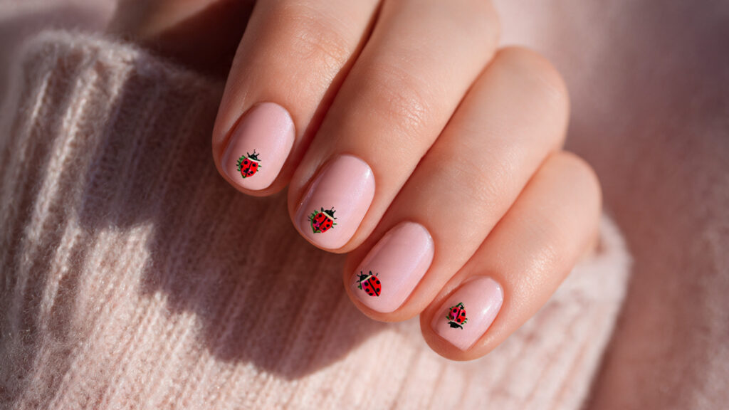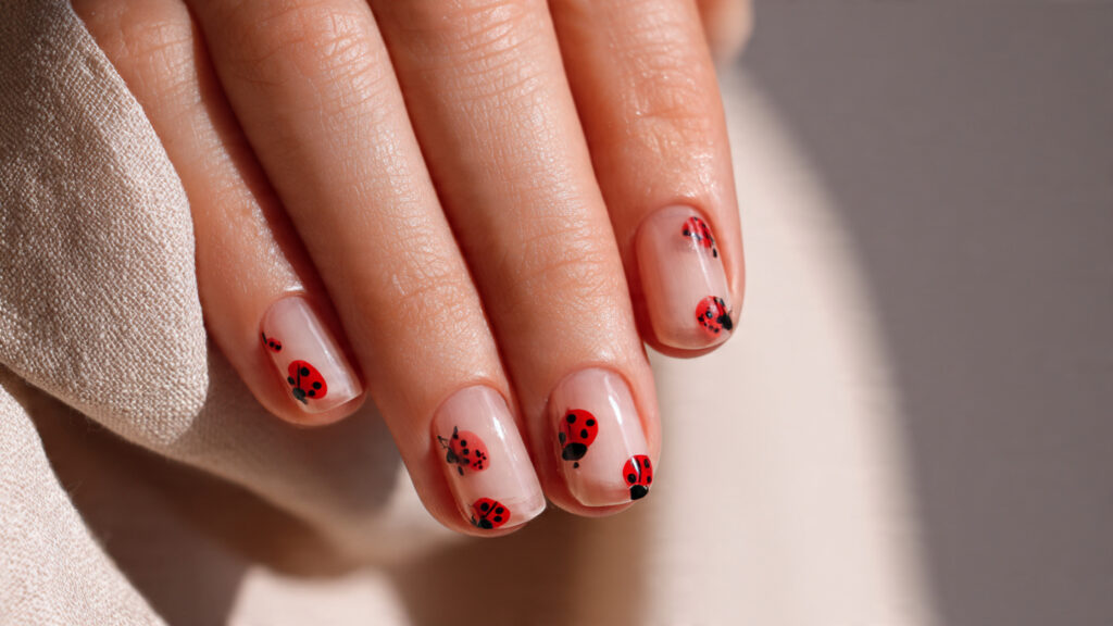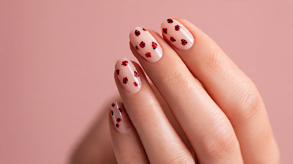 Minimal ladybug dot designs focus on subtle detail. Tiny red dots with black accents hint at the ladybug theme without full illustrations. This style is perfect if you enjoy understated nail art that still feels creative. The neutral base keeps everything soft and wearable.