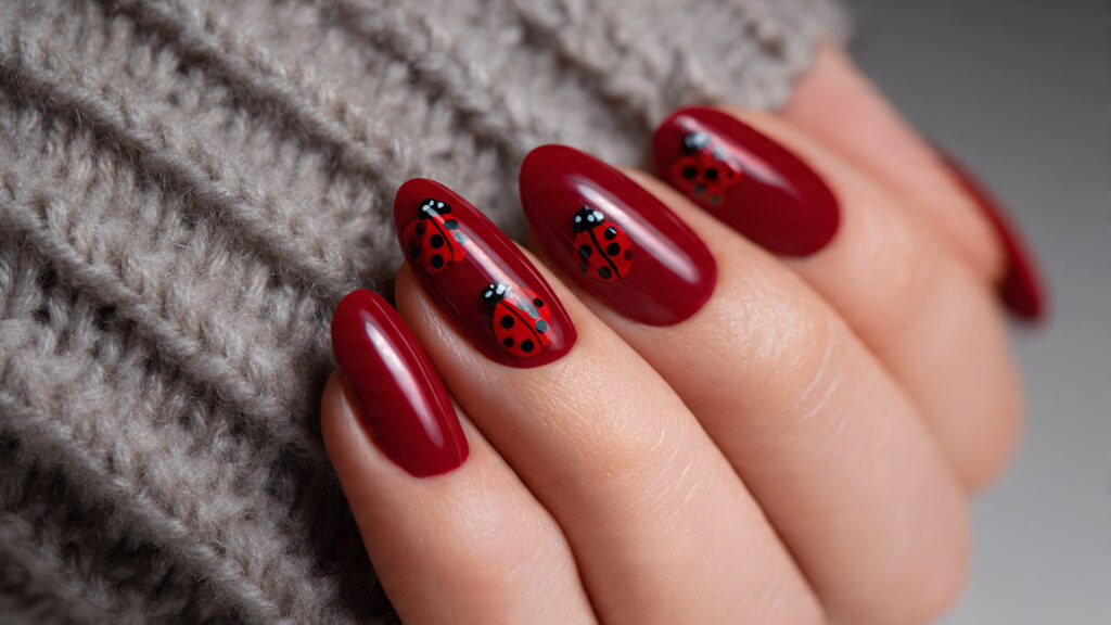 Matte red ladybug nails feel modern and bold. The matte finish adds depth, while glossy ladybug details create contrast. This texture mix makes the design visually interesting without adding extra colors.