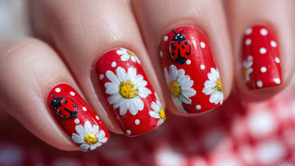 5. Ladybug and Daisy Combo Nails