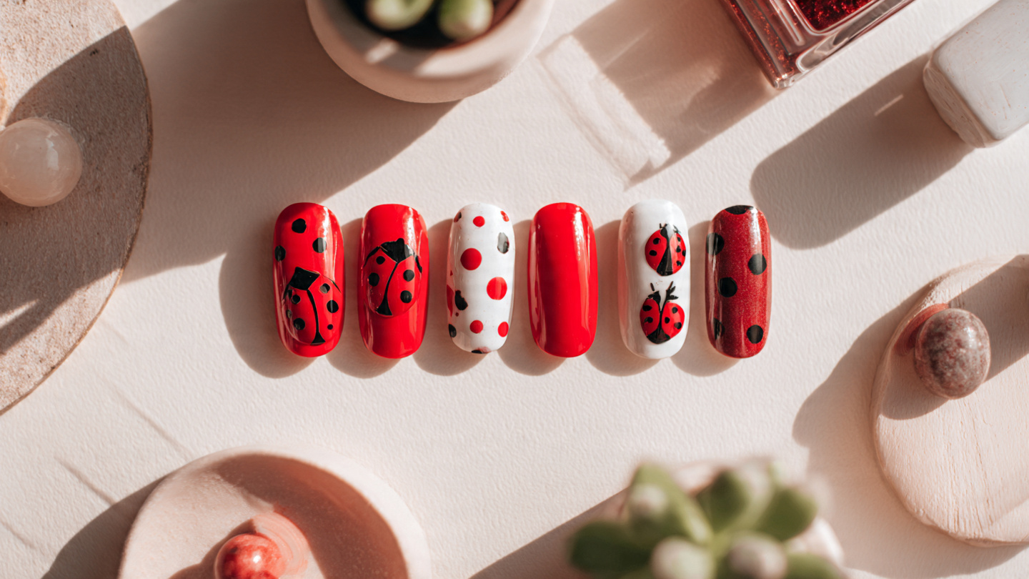 Balance is important here. Use polka dots on some nails and full ladybug designs on others. This keeps the manicure fun but not overwhelming.