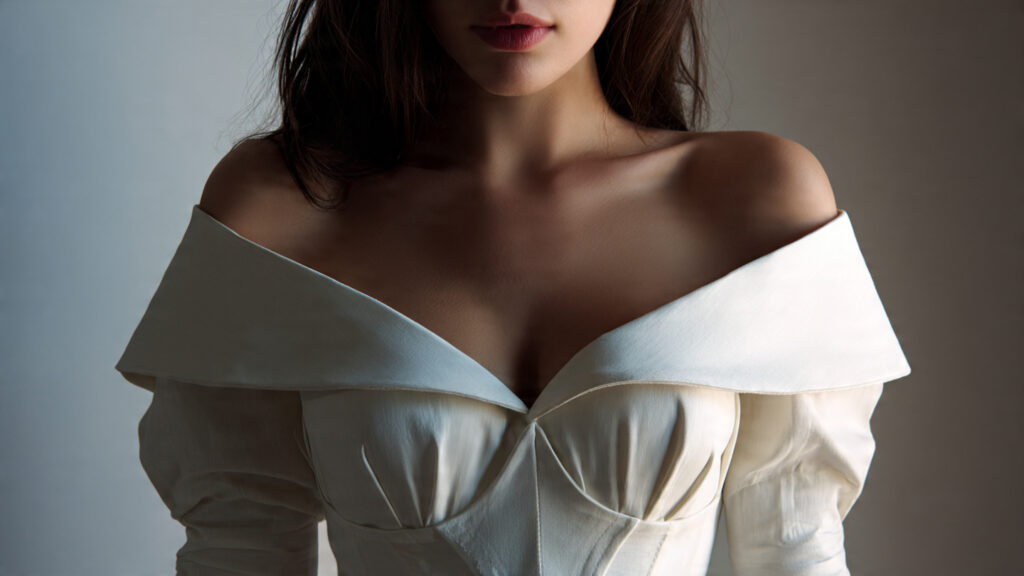 Structured off-shoulder tops draw attention outward, balancing the chest area. A firm neckline prevents slipping and maintains shape.