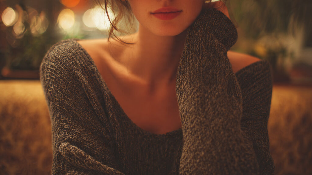 Scoop neck sweaters soften the chest area and create balance. This neckline frames the upper body without adding bulk. It works especially well in cooler seasons when layering matters.