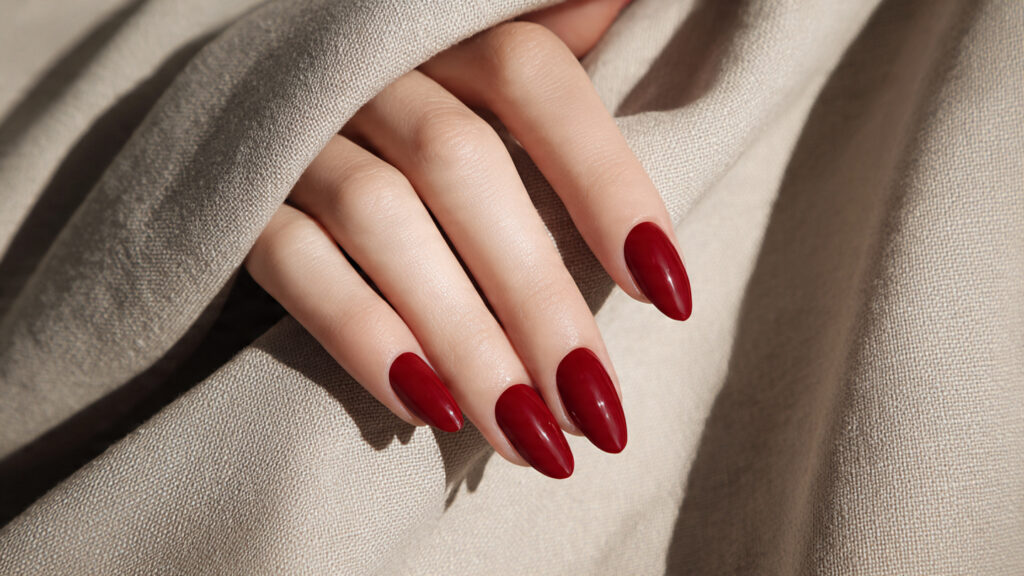 Crimson offers a slightly deeper alternative to classic red, giving the manicure a romantic and dramatic feel. The almond shape enhances the elegance, making fingers appear longer and more graceful. This shade pairs beautifully with evening outfits and soft fabrics, adding richness without overwhelming the look.