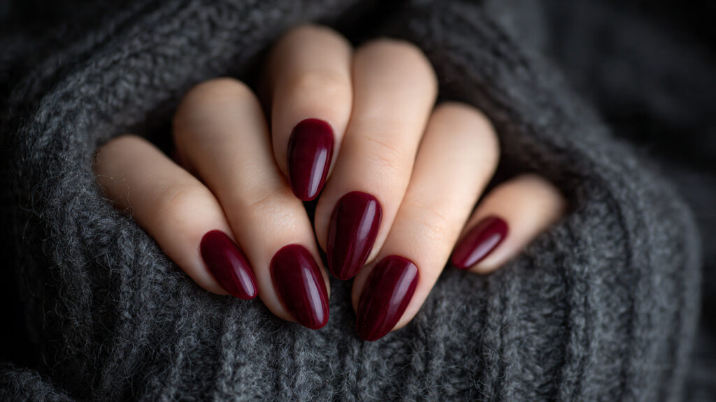 Wine tones also hide small imperfections better than brighter reds, which makes them practical for busy days. A slightly shorter length keeps the manicure wearable while still elegant. Add a thin layer of strengthening base coat to prevent staining, as darker shades can cling to the nail plate. The final result feels cozy, luxurious, and effortlessly stylish.