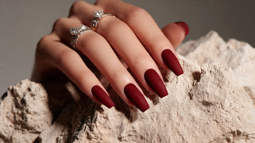 A matte ruby manicure transforms red into something softer and more understated. The velvety finish absorbs light instead of reflecting it, giving the nails a modern, high-fashion look. This style works beautifully with structured outfits and monochrome clothing, where textures become the focus. The coffin shape adds a contemporary edge without overwhelming the design.