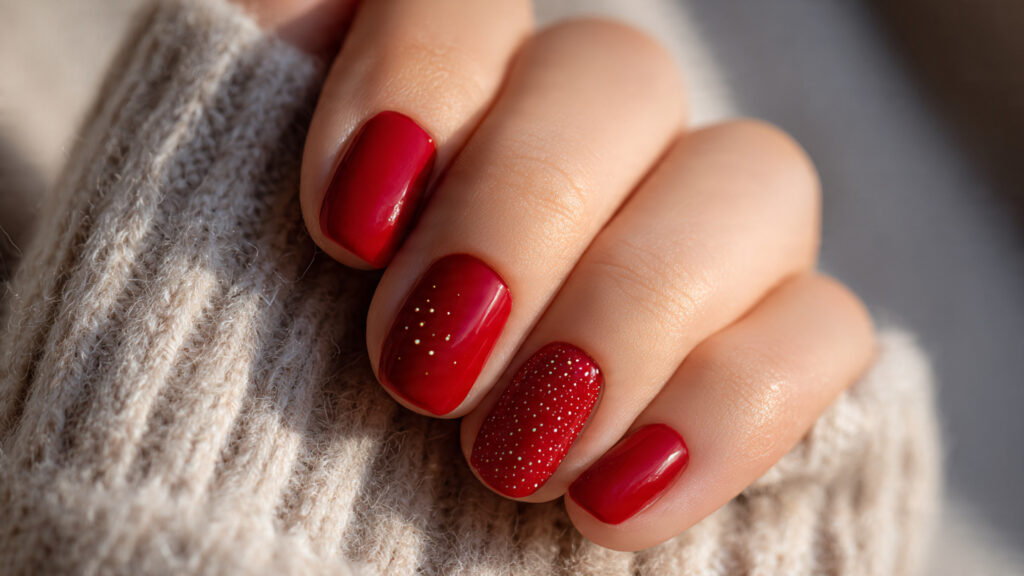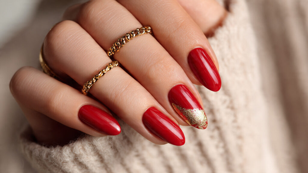 Adding gold foil to a red base introduces a touch of glamour without making the manicure too busy. A single accent nail keeps the design balanced and elegant. The metallic detail catches light softly, complementing the warmth of red and enhancing the overall richness. This look feels perfect for celebrations, dinners, or elevated everyday wear.