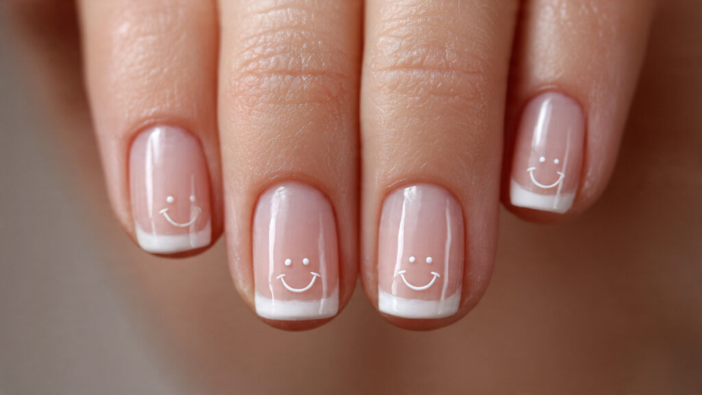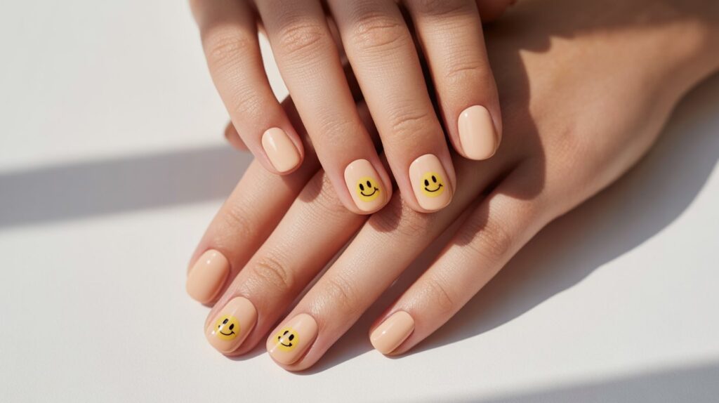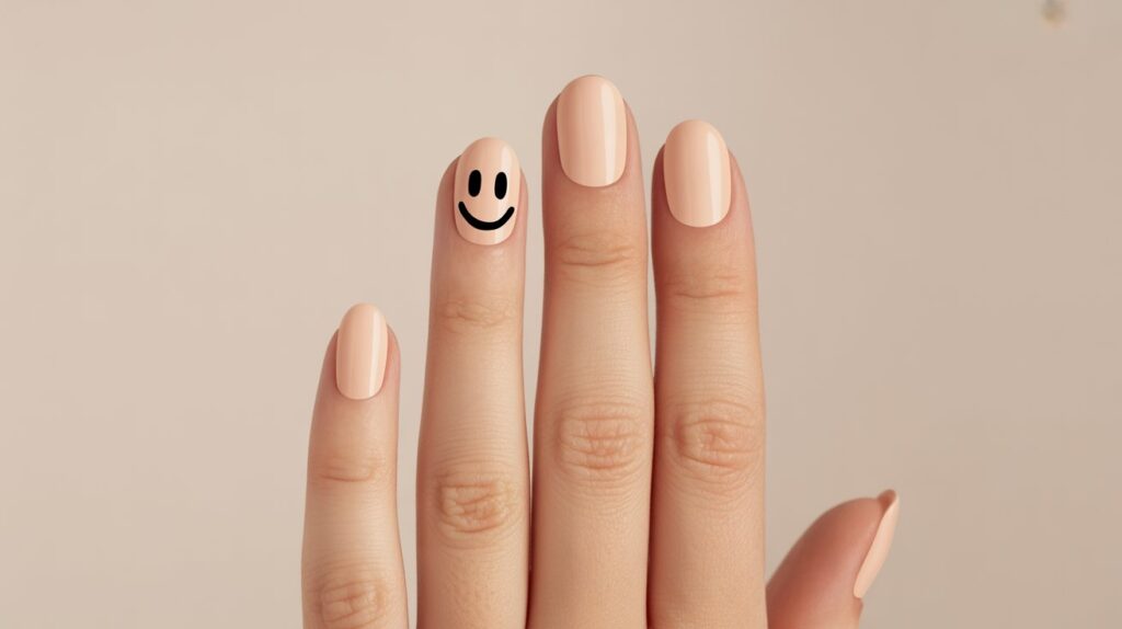 Usually, all nails are painted in nude, beige, or sheer tones, with just one or two accent nails featuring a tiny smiley face. The smiley is often black or white for a clean, understated look.