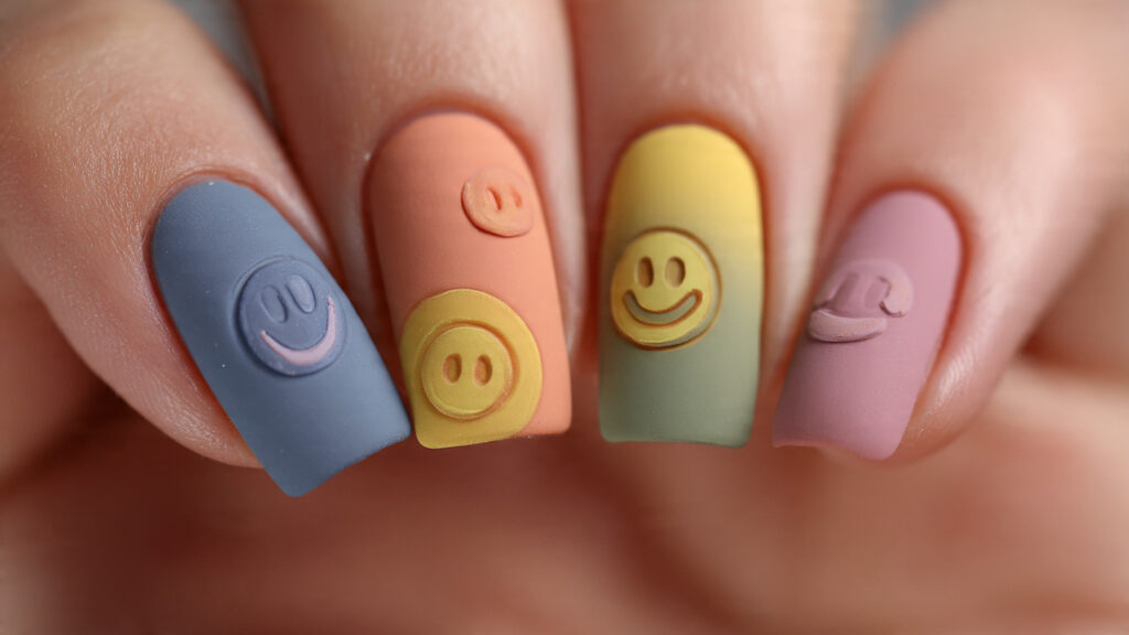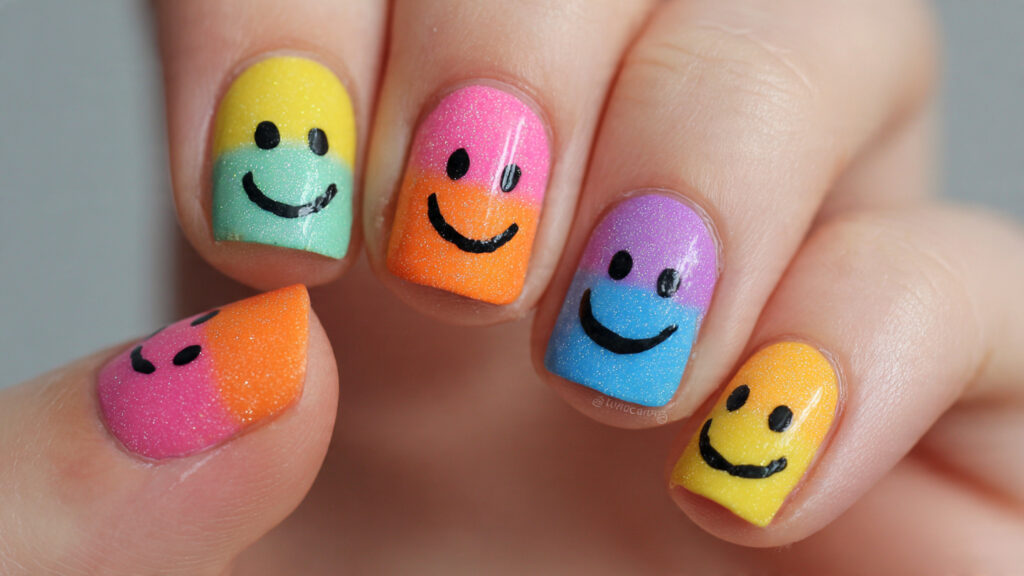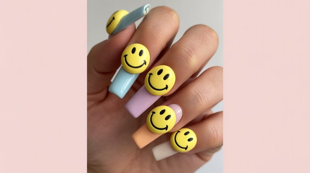 Each nail can feature a different color, expression, or pattern. Some smileys can be happy, others winking, and some abstract or distorted for a fun twist.