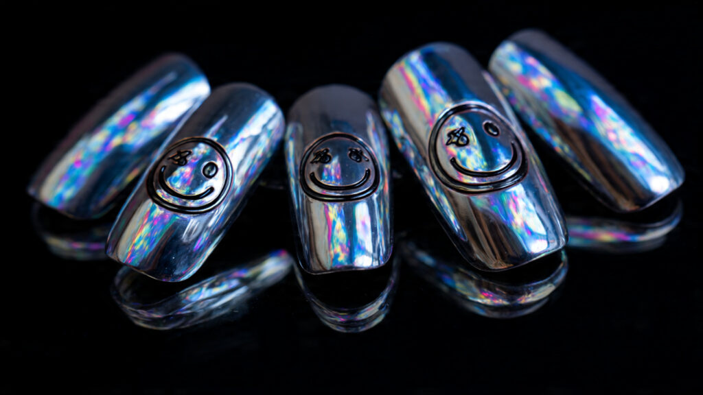 Chrome smiley nails bring a modern, high-fashion twist to playful nail art. The shiny metallic base instantly elevates the design.