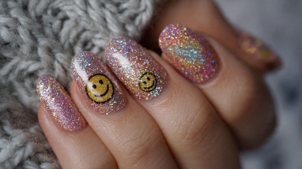 For those who love sparkle, glitter smiley nails add glamour to the trend. Glitter can be used as a base, accent, or outline around the smiley face.