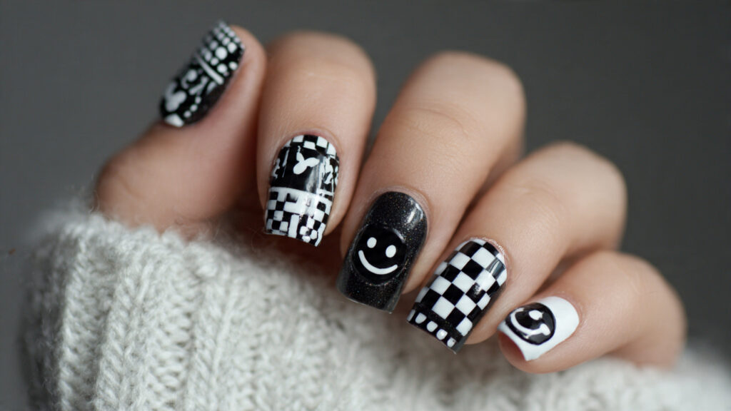 6. Black & White Smiley Face Nails