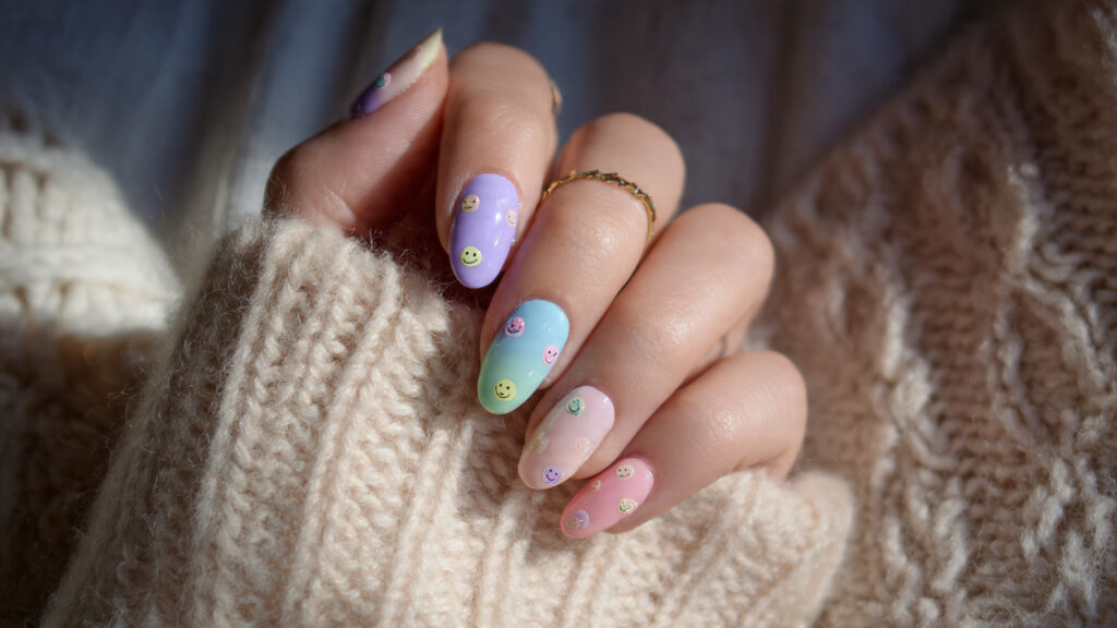 This style often features pastel bases with contrasting smiley faces or mixed pastel shades across each nail. It looks feminine, cozy, and aesthetic without being too bold.