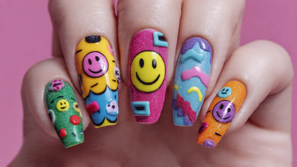 Y2K smiley nails often feature bright neon shades, playful icons, and high-shine finishes.